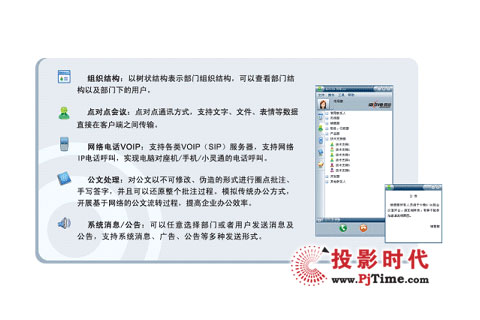 Center運營架構(gòu)為基礎(chǔ),有效整合了企業(yè)的如電話、傳真、手機、短信、E-mail、即時通訊等各種常用的通信設(shè)備和媒體應(yīng)用,并進行統(tǒng)一管理、計劃及協(xié)同,是一套集即時通訊、網(wǎng)絡(luò)電話、點對點會議、多方視頻會議、遠程教學(xué)、遠程監(jiān)控、組織結(jié)構(gòu)等為一體的桌面融合辦公系統(tǒng),能夠全面滿足企業(yè)遠程的日常交流、會議培訓(xùn)、協(xié)同辦公、商務(wù)談判、指揮調(diào)度、安全保衛(wèi)等各種需求。