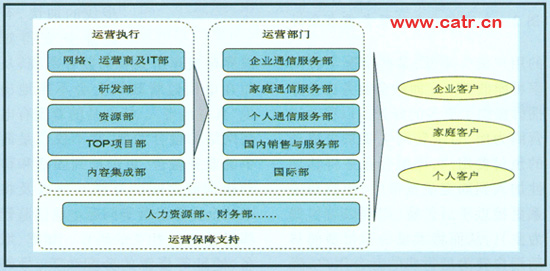 新型的融合產(chǎn)品和服務突破了原來的技術(shù)界限,如果還延續(xù)原有的按技術(shù)劃分的部門管理結(jié)構(gòu),必將產(chǎn)生過多的分支部門,造成企業(yè)結(jié)構(gòu)龐雜、效率低下,對新的綜合服務的市場需求缺乏感受力,新服務無法及時推向市場的問題。因此,重新進行部門劃分,實現(xiàn)內(nèi)部的協(xié)調(diào)配合是十分必要的。而業(yè)務提供的融合性、多元化及客戶的統(tǒng)一服務需求,使這種組織結(jié)構(gòu)的重新構(gòu)建最終將以客戶為中心進行構(gòu)建:在前端以客戶為中心劃分運營部門,實現(xiàn)對客戶的直接服務,在后端,以業(yè)務、運維等職責為中心部署組織結(jié)構(gòu),形成對運營執(zhí)行的支撐。