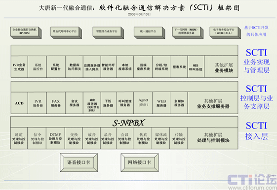 案例:我與大唐中聯(lián)(大唐融合)、和創(chuàng)世紀(jì)、華夏成訊等公司的技術(shù)開發(fā)人員經(jīng)過幾年來的摸索與實踐開發(fā),提出軟件化融合通信解決方案(SCTI)。通過計算機(jī)的軟件(通信服務(wù)系統(tǒng))來實現(xiàn)交換機(jī)上的所有通信功能,在互聯(lián)網(wǎng)上實現(xiàn)所有傳統(tǒng)通信網(wǎng)上的所有功能、還實現(xiàn)互聯(lián)網(wǎng)上的新的通信功能,在與傳統(tǒng)通信網(wǎng)上相連,只需增加一塊語音接口卡,就能實現(xiàn)互聯(lián)網(wǎng)與傳統(tǒng)通信的統(tǒng)一。此方案的成本比統(tǒng)一通信、融合通信等解決方案的成本要降幾十倍到上百倍。