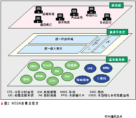 NGSN是為了適應網(wǎng)絡和技術(shù)的融合趨勢、運營商轉(zhuǎn)型的需求提出的,通過整合各種網(wǎng)絡業(yè)務能力,實現(xiàn)數(shù)據(jù)、業(yè)務、能力和管理的統(tǒng)一,從而能夠快速提供各種增值業(yè)務、協(xié)助運營商在價值鏈中處于主導地位。其概念層次如圖2所示。