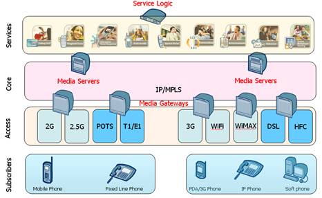 在下一代增值業(yè)務網(wǎng)絡里,業(yè)務平臺由一系列不同功能的應用服務器組成,同時為固網(wǎng)/移動/IP客戶提供增值業(yè)務。以彩鈴業(yè)務平臺為例,彩鈴的簽約用戶可以是移動用戶,也可以是固定電話,小靈通用戶或IP用戶;系統(tǒng)也會根據(jù)終端的能力和簽約類型,自動選擇是提供音頻彩鈴或視頻彩鈴業(yè)務。