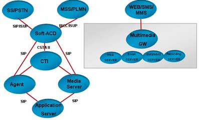 目前市場最常見的第三代呼叫中心是傳統(tǒng)的基于TDM的呼叫中心,應用了計算機電話集成(CTI)技術。隨著網(wǎng)絡的普及和NGN的發(fā)展,出現(xiàn)第五代呼叫中心NGCC。NGCC是以NGN為基礎構(gòu)建的呼叫中心系統(tǒng),核心控制設備處理呼叫的能力較傳統(tǒng)呼叫中心大幅提高。NGCC的網(wǎng)絡架構(gòu)和接口如圖3所示。