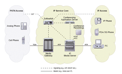 在這個網(wǎng)絡中,業(yè)務平臺需要引入通用的媒體資源處理平臺:IP媒體服務器。IP媒體服務器用來提供音頻,視頻,DTMF,TTS/ASR,F(xiàn)AX等媒體處理功能,為整個業(yè)務網(wǎng)絡提供增值服務。