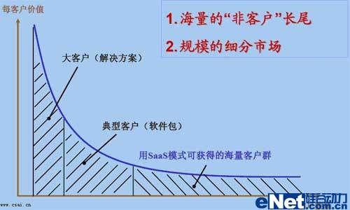 SaaS模式就是不論是什么樣的客戶都向其提供服務(wù),不論服務(wù)的時間長短,不論身處何地。傳統(tǒng)軟件是很難適應(yīng)普通客戶的,普通客戶付不出更多的投資,也不想軟件、硬件、服務(wù)都全面去投資,這樣就只有放棄使用軟件了。自然,軟件市場就少了一大群消費者。而SaaS模式將不細分客戶類型,讓人人都可使用軟件,讓個個都消費得起軟件?上攵@是一個怎么龐大的市場。如下圖所示: