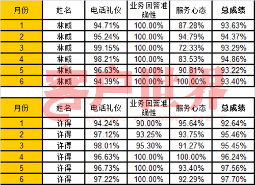 上面這兩張表格,是兩位員工的質(zhì)檢分?jǐn)?shù),從今年一月份開(kāi)始,一月到六月每個(gè)月的質(zhì)檢分?jǐn)?shù),你看到有總分,還有三個(gè)分項(xiàng)的成績(jī)。請(qǐng)問(wèn),林威是新員工,還是許得是新員工?我們下一期公布答案。