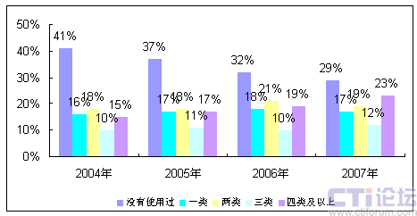 圖1 2004-2007年用戶使用智能手機(jī)使用的移動互聯(lián)網(wǎng)種類