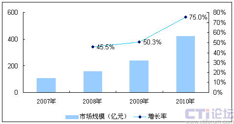 圖2 2008-2010年中國移動互聯(lián)網(wǎng)市場規(guī)模預(yù)測