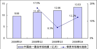 賽迪顧問預(yù)測,2008年全年中國統(tǒng)一通信市場都將保持快速的增長勢頭,雖然第三季度增長趨勢有所放緩,全球金融海嘯的反作用將進(jìn)一步提高企業(yè)對統(tǒng)一通信產(chǎn)品的認(rèn)知,促進(jìn)中國統(tǒng)一通信市場的發(fā)展,第四季度市場將出現(xiàn)反彈趨勢,增長速度超過12%,市場規(guī)模13.53億元,2008年全年中國統(tǒng)一通信市場規(guī)模將達(dá)到46.6億元,同比增長超過50%。
