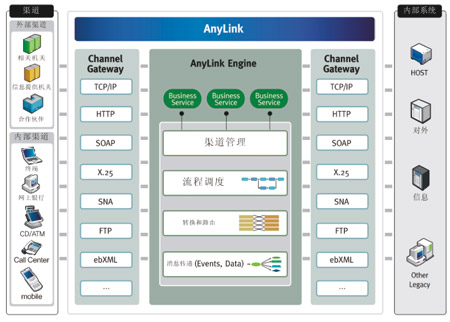 通過(guò)基于AnyLink的電子渠道統(tǒng)一接口平臺(tái)解決方案提供各類網(wǎng)關(guān)功能,可實(shí)現(xiàn)各種系統(tǒng)的整合,還提供報(bào)文轉(zhuǎn)換及路由的中介功能、管理和監(jiān)控所需的GUI工具,實(shí)現(xiàn)系統(tǒng)運(yùn)營(yíng)和維護(hù)及開(kāi)發(fā)的最佳化(如圖所示)。