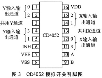 51系列單片機(jī)一般只有一個(gè)串行通路,通過串口與GSM模塊連接后,則不能再連接其他串口設(shè)備;而一些串口擴(kuò)展芯片成本較高,連接也較麻煩。本方法利用數(shù)控模擬開關(guān)CD4052來做多串口擴(kuò)展器,成本低廉而且接線簡(jiǎn)單。其引腳排列如圖3所示。