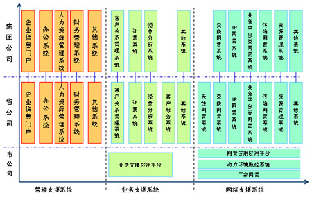 從系統(tǒng)的部署來看,主要集中在集團與省公司,其中,集團公司系統(tǒng)主要具備面向全公司的企業(yè)管理、經(jīng)營分析等功能;省公司從以職能管理為主逐步轉(zhuǎn)變?yōu)橐陨a(chǎn)管理為主,具有了越來越多的生產(chǎn)職能,在運營支撐系統(tǒng)建設(shè)中的作用更加突出;市公司的生產(chǎn)管理職能有所削弱,將主要負責(zé)市場的具體營銷、客戶支撐以及設(shè)備的現(xiàn)場維護等工作。現(xiàn)有系統(tǒng)主要存在以下幾個問題: