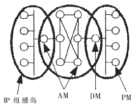 混合式組播的核心任務(wù)是為AM完成拓?fù)?包括數(shù)據(jù)拓?fù)浜涂刂仆負(fù)?的構(gòu)建。由于網(wǎng)絡(luò)狀況的動(dòng)態(tài)性,以及客戶端數(shù)量與客戶端加入系統(tǒng)時(shí)間的不確定性,當(dāng)前的應(yīng)用層組播方案一般需要每個(gè)結(jié)點(diǎn)定期與其他全部或一定比例的結(jié)點(diǎn)交換控制信息,以了解其他結(jié)點(diǎn)的狀態(tài),形成控制拓?fù)?保障數(shù)據(jù)拓?fù)涞慕研。在結(jié)點(diǎn)個(gè)數(shù)逐漸增加時(shí),網(wǎng)絡(luò)上的控制信息數(shù)量會(huì)占用大量的帶寬資源。應(yīng)用層組播的數(shù)據(jù)拓?fù)淇煞譃槎箢?信源樹和共享樹。信源樹必須為每個(gè)組播源保存路由信息,這樣會(huì)占用大量的系統(tǒng)資源。共享樹傳輸延時(shí)較大。IP視頻會(huì)議系統(tǒng)屬于實(shí)時(shí)交互應(yīng)用,視音頻數(shù)據(jù)占據(jù)很大的帶寬,并且對(duì)端到端傳輸延遲和網(wǎng)絡(luò)抖動(dòng)的要求很高,需要尋找一種既可以減少交換控制信息又可以保證視音頻數(shù)據(jù)實(shí)時(shí)傳輸?shù)耐負(fù)錁?gòu)建方式。為利用排列圖的優(yōu)越特性(如結(jié)點(diǎn)和邊的對(duì)稱性、故障恢復(fù)能力和容錯(cuò)能力、可以嵌入獨(dú)立的組播樹等),這里采用分層排列圖的結(jié)構(gòu)來組織混合式組播中的AM。
