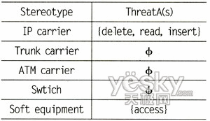 針對(duì)圖1中定義的定型以及對(duì)網(wǎng)絡(luò)安全構(gòu)成威脅的攻擊者的類型,可以定義出威脅函數(shù)TheatA(s)。其中A表示攻擊者類型,這里假定攻擊者為具備一般能力的外部攻擊者,即其可以竊聽到廣播信道上的數(shù)據(jù)流量,并可以插入或刪除數(shù)據(jù)流量,能夠利用系統(tǒng)漏洞入侵系統(tǒng);表示為模型中定義的定型威脅函數(shù)的值域?yàn)閧delete,read,insert,access}。根據(jù)NGN中承載網(wǎng)絡(luò)和計(jì)算節(jié)點(diǎn)的特性,我們可以得出如下威脅函數(shù),如表1所示。
