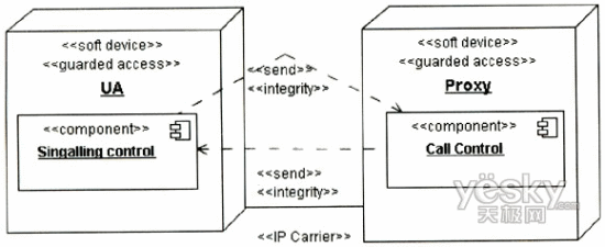 下面以基于SIP的兩方會(huì)話為例說明如何使用UMLsec描述業(yè)務(wù)安全需求。假定兩方呼叫發(fā)生在同一SIPProxy轄域的兩個(gè)用戶之間,要求保證用戶UA與SIPProxy之間的信令的完整性,不能被非法入侵者篡改。該場景的用例圖和部署圖分別如圖2、圖3所示。