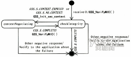 圖6中,在send()方法被調(diào)用后,Sender首先檢測是否已有可用的安全上下文,如果可用的安全上下文已經(jīng)存在,則可以利用該上下文的句柄作為參數(shù)之一,調(diào)用GSS-API的Get_GetMIC()方法。參數(shù)還包括有待進(jìn)行簽名的消息和可選的QoP。如果對(duì)消息簽名可以正常完成,Sender就可以將消息與簽名后生成的token一起送到目的地。如果簽名發(fā)生異常,則可以通過返回的錯(cuò)誤碼判斷原因。