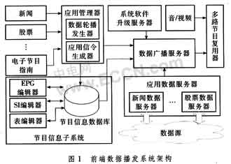 如圖1所示,前端數(shù)據(jù)播發(fā)系統(tǒng)主要包括應(yīng)用管理器,節(jié)目信息子系統(tǒng),數(shù)據(jù)廣播服務(wù)器,系統(tǒng)軟件升級(jí)服務(wù)器和應(yīng)用數(shù)據(jù)服務(wù)器等5個(gè)部分。