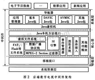 核心層主要采用C語(yǔ)言實(shí)現(xiàn)了Java層的功能,兩層之間通過(guò)Java本機(jī)方法接口連接。這層主要的功能模塊包括MPEG一2段過(guò)濾器,數(shù)據(jù)廣播協(xié)議棧,SI引擎,事件管理器,圖形系統(tǒng),虛擬文件系統(tǒng)和條件接人模塊等。在具體實(shí)現(xiàn)時(shí),對(duì)執(zhí)行效率要求較低的管理控制工作一般在系統(tǒng)層實(shí)現(xiàn),而對(duì)執(zhí)行效率要求高的工作在本層實(shí)現(xiàn)。這是因?yàn)樵谇度胧较到y(tǒng)中,C語(yǔ)言執(zhí)行效率要明顯優(yōu)于解釋性的lava語(yǔ)言。