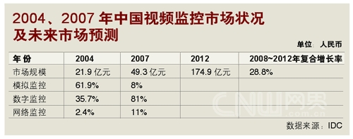 IDC的數(shù)字同樣樂觀。跟據(jù)IDC在2008年的預(yù)測,2008~2012年,中國視頻監(jiān)控市場的年均復(fù)合增長率將達(dá)28.8%,遠(yuǎn)高于IT市場投入的平均增長率。而在模擬、數(shù)字與IP模式(即網(wǎng)絡(luò)監(jiān)控)組成的視頻監(jiān)控市場里,IP的增長率又將高于前二者,成為市場增長的強(qiáng)勁動(dòng)力!保ㄗⅲ耗M監(jiān)控是指圖像信號(hào)在采集后,通過模擬信號(hào)傳輸?shù)姆忾]式視頻監(jiān)控系統(tǒng)模式;數(shù)字監(jiān)控是指圖像信號(hào)在采集后,經(jīng)過編碼轉(zhuǎn)化成數(shù)字信號(hào)再進(jìn)行傳輸?shù)姆忾]或半封閉式視頻監(jiān)控系統(tǒng)模式;網(wǎng)絡(luò)監(jiān)控是指系統(tǒng)建立在以網(wǎng)絡(luò)為基礎(chǔ)的傳輸平臺(tái)的開放式視頻監(jiān)控系統(tǒng)模式)。