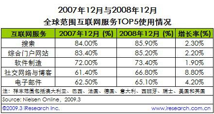 iResearch艾瑞咨詢根據(jù)NielsenOnline公布的全球范圍內(nèi)排名前五位的互聯(lián)網(wǎng)服務(wù)使用情況發(fā)現(xiàn),2008年在全球范圍內(nèi),社交網(wǎng)絡(luò)與博客的發(fā)展最為迅速。數(shù)據(jù)顯示,在包括搜索、綜合門戶網(wǎng)站、軟件制造、社交網(wǎng)絡(luò)與博客以及電子郵件在內(nèi)的五項(xiàng)互聯(lián)網(wǎng)服務(wù)中,相對2007年12月,2008年12月社交網(wǎng)絡(luò)與博客的使用情況增長率最高,達(dá)8.8%。而搜索、綜合門戶網(wǎng)站、軟件制造的增長率,分別為2.3%、2.2%、1.9%,均不足社交網(wǎng)絡(luò)與博客增長率的二分之一。高增長帶動(dòng)社交網(wǎng)絡(luò)與博客服務(wù)在2008年12月以66.8%的使用率反超電子郵件(65.1%),躍居TOP5網(wǎng)絡(luò)服務(wù)第四位。