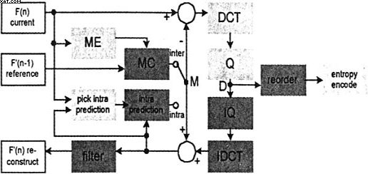 在前向通路(DCT到Q)中,每個MB可以以內(nèi)模式或交互模式編碼。在內(nèi)模式中,靠ME模塊在先編碼中求得參考MB。在交互模式中,從現(xiàn)在幀采樣中形成M。