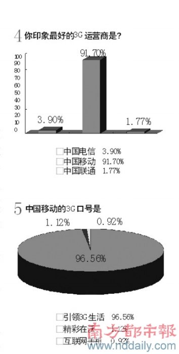 1、中國移動的3G口號是?超過98%的被訪者選擇了“引領3G生活”這一正確選項。2、你是否考慮升級到3G手機?選擇“會升級”的接近80%。如果考慮升級到3G手機,你最想使用哪家運營商的服務?中國移動奪得了超過九成的選票。但當最后問到,“你印象中,中國移動的3G標準是?”時,正確選項T D -SCD M A的得票率竟只有三成左右。