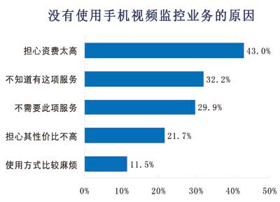 諾達(dá)咨詢對(duì)沒(méi)有使用手機(jī)視頻監(jiān)控的用戶原因進(jìn)行調(diào)查,結(jié)果表明,43%的用戶擔(dān)心資費(fèi)太高,其次對(duì)手機(jī)監(jiān)控不了解和不需要此項(xiàng)服務(wù)的用戶各占32%、30%。22%的用戶擔(dān)心性價(jià)比不高,12%用戶因?yàn)槭褂帽容^麻煩而不選擇手機(jī)視頻監(jiān)控服務(wù)。