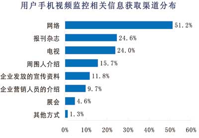 另一方面,運(yùn)營(yíng)商的宣傳不到位。從諾達(dá)咨詢調(diào)查數(shù)據(jù)來(lái)看,用戶目前獲得手機(jī)視頻監(jiān)控相關(guān)信息的主要渠道是互聯(lián)網(wǎng),有51%的用戶是通過(guò)互聯(lián)網(wǎng)了解手機(jī)視頻監(jiān)控的,而從傳統(tǒng)的電視媒體和報(bào)刊雜志獲得相關(guān)信息的用戶僅僅約各占24%,通過(guò)相關(guān)手機(jī)視頻監(jiān)控企業(yè)發(fā)放宣傳資料和介紹獲取相關(guān)信息的用戶各占12%和10%。由此可見(jiàn),手機(jī)視頻監(jiān)控的宣傳尚不到位,導(dǎo)致消費(fèi)者不能通過(guò)多方渠道獲取相關(guān)信息。
