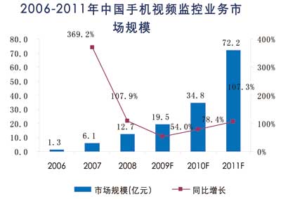 根據(jù)諾達(dá)咨詢《手機(jī)視頻監(jiān)控市場(chǎng)及用戶行為研究報(bào)告2009》研究結(jié)果,2006-2009年為手機(jī)監(jiān)控業(yè)務(wù)導(dǎo)入期,2006年手機(jī)監(jiān)控業(yè)務(wù)市場(chǎng)規(guī)模達(dá)到1.3億人民幣,手機(jī)監(jiān)控業(yè)務(wù)的年運(yùn)營(yíng)費(fèi)用自2009年開(kāi)始,將會(huì)逐步下降,目前平均約1000元/年,至2011年將逐步下降到600元/年,設(shè)備費(fèi)用也將由目前的3000元/點(diǎn),逐步下降到2011年的1000元/點(diǎn)。