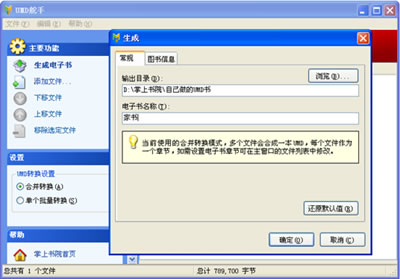 點(diǎn)擊“添加文件”,將你想要轉(zhuǎn)換的電子書添加至軟件窗口,大批量轉(zhuǎn)換的用戶可一次性選中多個(gè)文件添加,添加完畢后,你可以隨時(shí)通過“上移文件”和“下移文件”按鈕來調(diào)整你文件擺放的位置,或者移除不需要轉(zhuǎn)換的文件。確認(rèn)后,選擇合并轉(zhuǎn)換或是單個(gè)批量轉(zhuǎn)換,合并轉(zhuǎn)換是將添加的文件合并成一本UMD電子書,單個(gè)批量轉(zhuǎn)換是每個(gè)文件生成一本UMD電子書。設(shè)置完后點(diǎn)擊“生成電子書”,在彈出的對(duì)話框中設(shè)置輸出目錄、電子書名稱、電子書封面、作者、來源后點(diǎn)擊確認(rèn),出現(xiàn)正在轉(zhuǎn)換的進(jìn)度條,完成制作后會(huì)自動(dòng)打開電子書所在的目錄,你的電子書制作完成,是不是非常簡單。