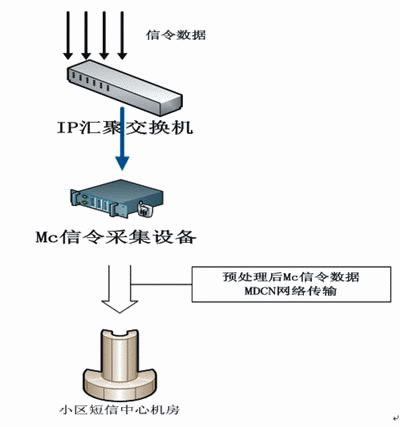 在軟交換模式下,在不影響信令傳輸?shù)那疤嵯拢^(qū)短信系統(tǒng)通過對Mc接口(MGW與MSCServer之間)進行IP數(shù)據(jù)采集,替代采集A接口七號信令數(shù)據(jù),對采集到的Mc接口數(shù)據(jù)進行分析、合成,獲取到小區(qū)短信平臺所需的重要、關鍵數(shù)據(jù)。