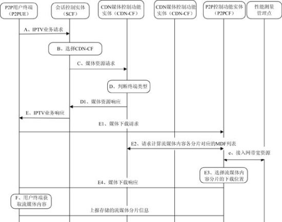 本架構(gòu)的最大特點是結(jié)合CDN和NGN架構(gòu)(注:為了簡化沒有給出詳細的NGN相關(guān)控制實體,架構(gòu)中只體現(xiàn)了會話控制實體和資源接納控制功能實體),在此基礎(chǔ)上引入P2P相關(guān)功能,包括P2P控制實體和P2P用戶終端。通過對基于NGN的IPTV架構(gòu)和CDN架構(gòu)的改進,使該架構(gòu)既能夠具備電信網(wǎng)中網(wǎng)絡(luò)資源可控、可管的特征,又通過引入P2P具備了一定的靈活性和自組織能力,將電信網(wǎng)和互聯(lián)網(wǎng)技術(shù)的優(yōu)勢均集中在了一起。