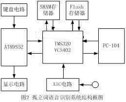 此語音識別系統(tǒng)的目的讓機器人能聽懂我們所發(fā)出的簡單的命令,首先由TLC320AD50C采集計算機聲卡的語音,經(jīng)過轉(zhuǎn)換后送給TMS320VC5402, TMS320VC5402完成語音信號處理,即識別出所發(fā)出的語音,然后把結(jié)果送給AT89S52顯示,同時通過串行通訊送給機器人(PC-104),以使機器人能夠控制自己的行動。其結(jié)構(gòu)框圖如圖2所示。