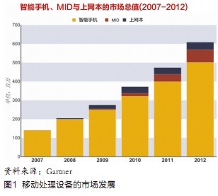 隨著3G對(duì)移動(dòng)信息處理的促進(jìn),未來(lái)幾年,MS市場(chǎng)尤其是智能化接入設(shè)備市場(chǎng)的增長(zhǎng)將非常迅速,根據(jù)有關(guān)機(jī)構(gòu)的分析,智能手機(jī)、MID、上網(wǎng)本等移動(dòng)上網(wǎng)裝置從2007年至2012年的年復(fù)合成長(zhǎng)率將達(dá)到36%,而到2012年為止,市場(chǎng)上將會(huì)有超過(guò)6億部的移動(dòng)終端,如圖1所示,藉由3G移動(dòng)通信和WLAN的帶動(dòng),移動(dòng)接入設(shè)備將實(shí)現(xiàn)從人手一部向人手兩部甚至多部的方向邁進(jìn)。