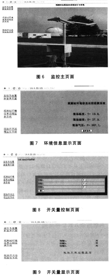 該監(jiān)控主頁面左側(cè)顯示有3個模塊:重新登陸頁面;觀測站遠程環(huán)境信息檢測系統(tǒng),能方便實時地查詢現(xiàn)場的環(huán)境狀態(tài),如圖7所示;現(xiàn)場開關(guān)的遠程監(jiān)控系統(tǒng),可以控制3個開關(guān)量的開關(guān),如圖8所示,并能查詢它們當前狀態(tài),設(shè)置監(jiān)控頁面每隔15