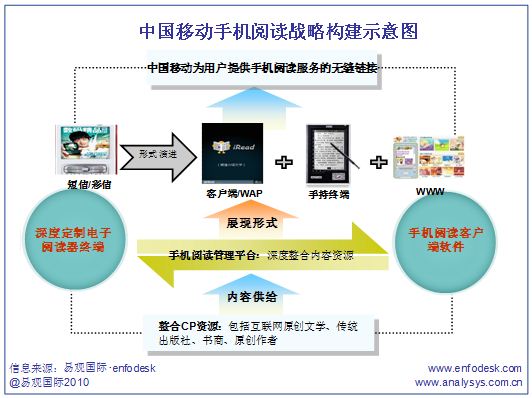 易觀國際(Analysys International)分析認為,中國移動發(fā)展手機閱讀的整體思路是基于渠道資源,縱貫內(nèi)容、終端以強勢整合手機閱讀的產(chǎn)業(yè)鏈。將原有的手機閱讀的短信/彩信形式演變?yōu)榭蛻舳塑浖?WAP、手持終端、WWW的形式,最終為用戶提供手機閱讀的無縫鏈接體驗。