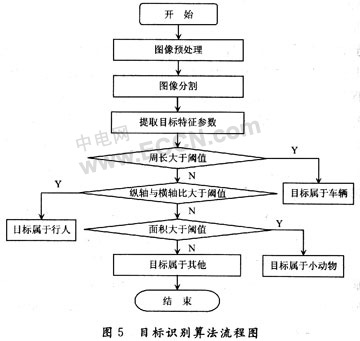 根據(jù)運(yùn)動目標(biāo)的分類可知,車輛的周長是最長的,所以首先直接判斷圖像中運(yùn)動目標(biāo)的周長,如果大于某一設(shè)定好的閾值,則可輕易判斷出視場中目標(biāo)屬于車輛。余下的目標(biāo)中,行人比小動物的縱橫軸比值大,設(shè)定縱橫軸比閾值,據(jù)此可以判斷出目標(biāo)屬于行人。最后將設(shè)定一個(gè)面積閾值,面積大于此閾值則可判斷目標(biāo)屬于小動物,否則目標(biāo)屬于其他一些環(huán)境的干擾。