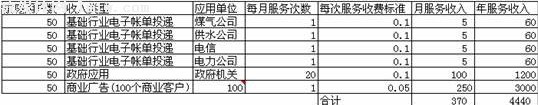 那么如果一家運(yùn)營(yíng)商已經(jīng)設(shè)計(jì)出了符合市場(chǎng)需求的業(yè)務(wù)模式,未來(lái)的盈利前景將會(huì)怎樣呢?不妨讓我們模擬分析一下。假設(shè)一個(gè)運(yùn)營(yíng)商擁有50萬(wàn)左右的城市家庭用戶(hù)。在基礎(chǔ)行業(yè)領(lǐng)域,每月可以幫助煤氣、供水、電信和電力公司各發(fā)送1次賬單;在商業(yè)客戶(hù)方面,擁有百家左右的合作伙伴,每月每家合作伙伴發(fā)送1條短信廣告;在政府機(jī)關(guān)領(lǐng)域,粗略估算政府機(jī)關(guān)每月總計(jì)使用20次左右;每個(gè)家庭用戶(hù)則每月收到電信短信約125條。假設(shè)運(yùn)營(yíng)商的服務(wù)資費(fèi)中,除了商業(yè)廣告為0.05元/條外,均為0.1元/條。那么,盈利情況又該怎樣呢?