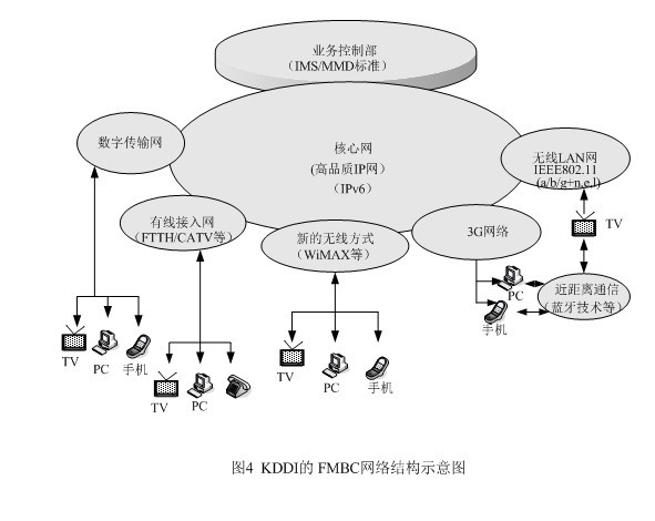 為了在市場競爭中立于不敗之地,KDDI另辟稀徑,提出了將固定網(wǎng)、移動網(wǎng)、因特網(wǎng)和電視廣播相融合的概念,它與朝日新聞、朝日電視簽署合作框架,就是它的集中代表。FMBC是超3G的構(gòu)想,是以移動通信為基礎,與固定電話網(wǎng)及因特網(wǎng)進行融合,現(xiàn)在又把廣播電視納入,這樣它就成了KDDI的NGN了。FMBC的網(wǎng)絡結(jié)構(gòu)請見圖4。從圖4上不難發(fā)現(xiàn)NGN的影子,特別是業(yè)務控制部的設立,并采用ISM/MMD標準,將網(wǎng)絡與應用分開,以利新業(yè)務的開拓,同時完成核心網(wǎng)的IP化,這些都是NGN的基本概念。
