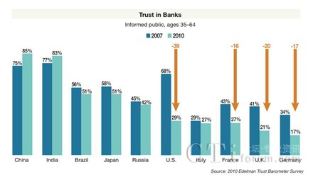 全球經(jīng)濟的垮臺在全球范圍內(nèi)嚴重損害了人們對銀行的信任。Edelman的報告表明自金融危機以來銀行業(yè)的信任度大幅下降,與之形成鮮明對比的是其它行業(yè)企業(yè)信任度的提升。