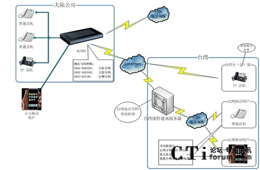 “兩岸通”利用最新的VOIP技術(shù),實現(xiàn)大陸固話辦公電話系統(tǒng)通過互聯(lián)網(wǎng)遠(yuǎn)程連接到臺灣的電話系統(tǒng),實現(xiàn)兩岸低資費甚至零資費電話互打。