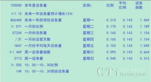 在上圖所示的比例分解過(guò)程中,我們假設(shè)去年的總來(lái)電量為720000個(gè)。在此基礎(chǔ)上,根據(jù)市場(chǎng)、銷售預(yù)測(cè)以及過(guò)去幾年歷史數(shù)據(jù)增長(zhǎng)趨勢(shì)等數(shù)據(jù)測(cè)算出未來(lái)一年的話務(wù)量預(yù)計(jì)增長(zhǎng)12%。這樣我們就得到了預(yù)計(jì)未來(lái)一年的總來(lái)電量為806400個(gè)。根據(jù)歷史數(shù)據(jù)的測(cè)算分析,一月份的來(lái)電量通常占全年總來(lái)電量的7.1%,因此明年一月份的來(lái)電量預(yù)計(jì)為57254個(gè)。由于呼叫中心是7X24小時(shí)運(yùn)營(yíng)的,所以一月份平均每天的來(lái)電量為57254/31=1847個(gè)。由于大多數(shù)呼叫中心的來(lái)電量規(guī)律是以一周為周期循環(huán)波動(dòng)的,因此我們接下來(lái)要測(cè)算四個(gè)(或五個(gè))周一的話務(wù)指數(shù),以覆蓋四個(gè)或五個(gè)周一的來(lái)電量情況。我們用周一來(lái)電量占全周來(lái)電量的相對(duì)比例除以其七分之一的絕對(duì)比例,得出周一的來(lái)電量指數(shù)為1.469,也就是說(shuō),周一的來(lái)電量是相對(duì)較多的,相當(dāng)于一周日平均來(lái)電量的約147%。由此我們得出周一話務(wù)量為2713個(gè)。然后我們?cè)俑鶕?jù)由歷史數(shù)據(jù)測(cè)算出的周一一天中48個(gè)半小時(shí)時(shí)段占全天來(lái)電量的比例測(cè)算出周一上午10:00-10:30的來(lái)電量為149個(gè)。剩下的周二至周日都可以采用同樣的方法來(lái)推算預(yù)測(cè)。