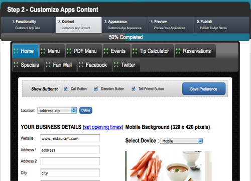 Bizness Apps采用可視化操作界面,用戶只需要點擊設(shè)置相關(guān)選項就能完成應(yīng)用的開發(fā)工作。因此,Bizness Apps很適合缺少專業(yè)技術(shù)人員的小企業(yè)開發(fā)本行業(yè)應(yīng)用。利用Bizness Apps開發(fā)行業(yè)應(yīng)用只需五步。首先,開發(fā)者選擇對應(yīng)的行業(yè)后,需要為應(yīng)用添加功能組件。第二步,為訂制好的功能組件添加內(nèi)容。第三步,為應(yīng)用選定外觀的設(shè)計方案。第四步,預(yù)覽經(jīng)過定制后的應(yīng)用。最后,完成付費后即可發(fā)布你的應(yīng)用。