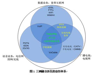 這種沖擊表現(xiàn)在信息通信領(lǐng)域的“時(shí)移事易”上,一個(gè)是在時(shí)間維度上,一個(gè)是在影響產(chǎn)業(yè)發(fā)展重大事件的維度上。其長(zhǎng)期累積的結(jié)果是,當(dāng)前全球范圍內(nèi)影響最大、最深遠(yuǎn)的莫過(guò)于寬帶網(wǎng)絡(luò)成為國(guó)家的信息化基礎(chǔ)設(shè)施。寬帶的普及深刻的影響和推動(dòng)了以TCP/IP為技術(shù)基礎(chǔ)的“三重播放”和在市場(chǎng)競(jìng)爭(zhēng)層面的“多重捆綁”業(yè)務(wù)營(yíng)銷策略,這構(gòu)成了三網(wǎng)融合最基本的內(nèi)容,隨之帶動(dòng)了近年已成為業(yè)界關(guān)注焦點(diǎn)的視頻業(yè)務(wù)向“一云三網(wǎng)多屏”的方向發(fā)展?傊,新技術(shù)和新產(chǎn)業(yè)發(fā)展導(dǎo)致傳統(tǒng)的電信業(yè)和廣播電視業(yè)從封閉逐步走向開(kāi)放,渠道、內(nèi)容、消費(fèi)者偏好均從單一走向多元;對(duì)消費(fèi)者而言,信息的流動(dòng)從單向變?yōu)殡p向和多向,新媒體、全媒體、自媒體在社會(huì)上的份量快速上升。 而來(lái)自市場(chǎng)的需求變化是:過(guò)去那種內(nèi)容和服務(wù)緊密捆綁于網(wǎng)絡(luò)的業(yè)務(wù)模式被開(kāi)放的互聯(lián)網(wǎng)沖擊得疲于招架,網(wǎng)絡(luò)和渠道的地位不斷下降,處于底層的網(wǎng)絡(luò)整合開(kāi)始朝著契合于上層內(nèi)容和應(yīng)用整合的方向發(fā)展;內(nèi)容和應(yīng)用成為產(chǎn)業(yè)發(fā)展的新重心,傳統(tǒng)運(yùn)營(yíng)商在挖潛增效做好“智能管道”的同時(shí),也希望借助三網(wǎng)融合躋身綜合信息服務(wù)領(lǐng)域。表現(xiàn)在網(wǎng)絡(luò)層面,傳統(tǒng)的電信業(yè)務(wù)大范圍地向?qū)拵P網(wǎng)上遷移;傳統(tǒng)的有線電視網(wǎng)進(jìn)軍新媒體,“電信化”色彩越來(lái)越強(qiáng)。在業(yè)務(wù)層面,如下圖示所,典型的融合業(yè)務(wù)如有線寬帶、IPTV、VoIP、手機(jī)視頻、互聯(lián)網(wǎng)智能電視等成為雙方競(jìng)爭(zhēng)的主陣地。