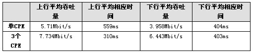 下面給出單扇區(qū)范圍內(nèi),在64QAM調(diào)制格式的工作方式下,單個CPE工作和三個CPE同時工作時的吞吐量和響應(yīng)時間的典型測試結(jié)果,業(yè)務(wù)類型均為BE。