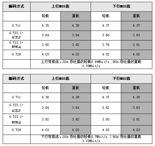 表2和表3是對于64QAM3/4調(diào)制格式信號在背景流輕載(20%)和重載(90%)條件下的VoIP性能典型評估結(jié)果。