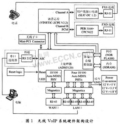 系統(tǒng)硬件的整體架構(gòu)設(shè)計(jì)如圖1所示。系統(tǒng)硬件主要由五部分組成:ADM5120主處理器部分、通話(huà)控制部分、無(wú)線(xiàn)子卡部分、存儲(chǔ)部分和外設(shè)連接部分。通話(huà)控制部分采用Infineon公司語(yǔ)音芯片VINETIC-2CPE,Version 2.1(PEB3322)為子處理器,外接A/D,D/A轉(zhuǎn)換功能的用戶(hù)接口電路SLIC-DC PEB4268,與存儲(chǔ)部分一起構(gòu)成語(yǔ)音實(shí)時(shí)處理骨架;無(wú)線(xiàn)子卡部分采用Atheros公司的WMIA-165G 802.11g Mini PCI模塊,并用Madwifi驅(qū)動(dòng)無(wú)線(xiàn)子卡;存儲(chǔ)部分使用2塊SDRAM存儲(chǔ)器和1塊NOR FLASH存儲(chǔ)器;外設(shè)連接部分包括一個(gè)WAN口和四個(gè)LAN口、Mini-PCI接口、輸出模擬電話(huà)信號(hào)的RJ-11接口,以及用于調(diào)試的RS 232串口。