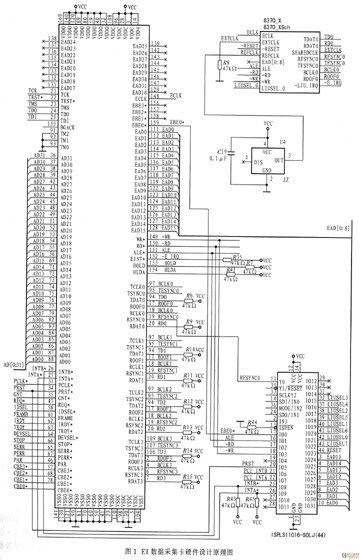 隨著電信網(wǎng)絡(luò)迅速發(fā)展,基于軟交換技術(shù)的NGN網(wǎng)絡(luò)應(yīng)運(yùn)而生。在構(gòu)建中,NGN需通過信令網(wǎng)關(guān)SG與現(xiàn)有的七號(hào)信令網(wǎng)互通,但在物理上采用HDLC格式的 E1傳輸。為了維護(hù)NGN網(wǎng)絡(luò),實(shí)現(xiàn)不同采集口的多協(xié)議關(guān)聯(lián)、呼叫的合成等功能,相應(yīng)的測(cè)試儀表必須提供網(wǎng)卡和E1卡的測(cè)試接口。根據(jù)NGN網(wǎng)絡(luò)測(cè)試儀表的總體設(shè)計(jì)方案要求,數(shù)據(jù)采集卡采用PCI插槽,E1信號(hào)經(jīng)物理接口器件成幀,通過串口送給MUSYCC,完成消息重組,最后通過PCI總線將消息送至上層軟件進(jìn)行協(xié)議分析處理。數(shù)據(jù)采集卡提供網(wǎng)絡(luò)接口的物理層、鏈路層功能以及PCI規(guī)范接口,可同時(shí)監(jiān)測(cè)8路E1信號(hào)。