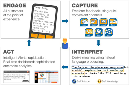 該應(yīng)用軟件能夠捕捉所有聯(lián)絡(luò)渠道上任何形式的客戶反饋;包括文本,郵件,電話,網(wǎng)絡(luò)或者手寫的。然后系統(tǒng)利用先進(jìn)的模式識(shí)別規(guī)則對客戶反饋進(jìn)行破譯并采取適當(dāng)?shù)男袆?dòng);直接響應(yīng)客戶,將信息轉(zhuǎn)發(fā)給其他更適合響應(yīng)的人并創(chuàng)建實(shí)時(shí)管理信息。