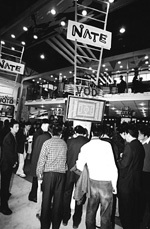 韓國移動通信運營商SK電訊的展臺是整個展會上最熱鬧的地方之一,能歌善舞的韓國藝人吸引了很多觀眾駐足。在“為人類的移動互聯(lián)通信, SK電訊與您攜手”的主題下,SK電訊展示了移動增值及移動互聯(lián)服務(wù)。