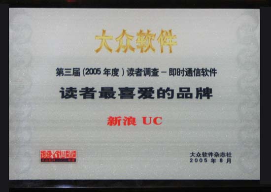 8月24日,在國內(nèi)知名IT媒體《大眾軟件》創(chuàng)刊10周年慶典上,《大眾軟件》隆重公布了“《大眾軟件》第三屆(2005年度)讀者調(diào)查報告”,新浪UC以12.20%的市場占有率,逼近排名第二的MSN(17.81%),實至名歸在國內(nèi)IM市場獲得第三的成績,并獲得《大眾軟件》頒發(fā)的“第三屆(2005年度)讀者調(diào)查——即時通訊軟件”市場“讀者最喜愛的品牌”(圖一)。